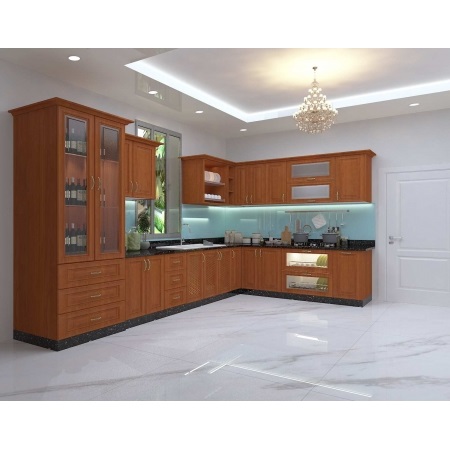 tủ bếp chữ L gỗ xoan đào tự nhiên sang trọng