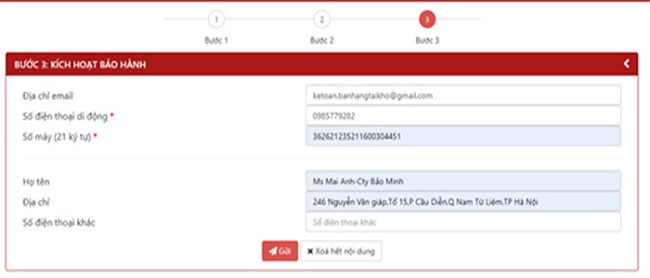 Bước 3: Bạn sẽ điền các thông tin yêu cầu để kích hoạt bảo hành cho máy. Thông tin bao gồm: Địa chỉ gmail, số điện thoại di động, số máy (21 ký tự), họ tên, địa chỉ và số điện thoại. Sau khi điền xong bạn hãy kiểm tra một lần và bấm gửi nếu thông tin không có gì sai sót.