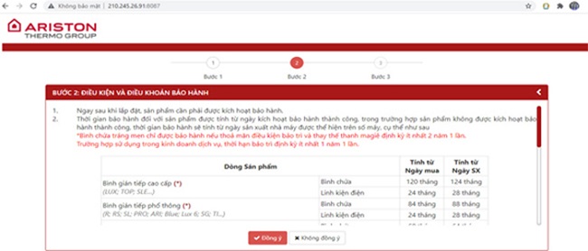 Bước 2: Lúc này màn hình sẽ hiện ra các Điện kiện và điều khoản bảo hành của bình nóng lạnh Ariston. Bạn hãy kiểm tra các thông tin, sau đó nhấn nút Đồng Ý để chuyển sang bước tiếp theo.