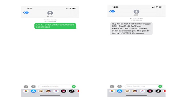 II, Cách 2: Kích hoạt bảo hành điện tử Ariston bằng tin nhắn SMS